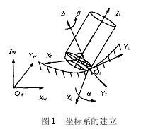 如圖1所示,五軸環(huán)行刀NC加工的局部坐標(biāo)系L表示為XL軸、YL軸和ZL軸,YL軸總是指向該刀觸點(diǎn)(CutterContactPoints,簡稱CC點(diǎn))OL的走刀方向f,ZL軸指向曲面外法線方向n,而XL軸則由YL軸和ZL軸的右手法則確定。刀具一般繞XL軸由ZL軸向YL軸方向旋轉(zhuǎn)一個(gè)導(dǎo)前角(后跟角)a,和繞ZL軸旋轉(zhuǎn)一個(gè)又一個(gè)側(cè)偏角b。另外,在刀位點(diǎn)(CutterLocationPoints,簡稱CL點(diǎn))OT處還可定義刀具坐標(biāo)系T(XT,YT,ZT),其中YT軸指向CL點(diǎn)和CC點(diǎn)連線方向,ZT軸為刀軸矢量方向,XT軸是由YT軸和ZT軸的右手法則確定的方向,坐標(biāo)原點(diǎn)位于刀具中心點(diǎn)(即CL點(diǎn))OT。為了簡化干涉檢查,以形狀較為規(guī)則的刀具表面作為基準(zhǔn)進(jìn)行干涉檢測,加工曲面經(jīng)過離散后以一組特征點(diǎn)的形式來表示曲面形狀,這些特征點(diǎn)的原始數(shù)據(jù)均在世界坐標(biāo)系W中表示,因此首先必須將特征點(diǎn)數(shù)據(jù)從世界坐標(biāo)系W(OW-XW,YW,ZW)變換到局部坐標(biāo)系L(OL-XL,YL,ZL),再由局部坐標(biāo)系L變換到刀具坐標(biāo)系T(OT-XT,YT,ZT)中來表示。