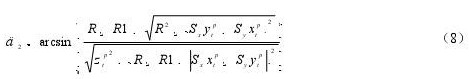當(dāng)點(diǎn)Pi在旋轉(zhuǎn)過程中不與圓柱截線相交時(shí),則點(diǎn)Pi’可能與圓環(huán)截面4次曲線或刀具底平面截線相交。與圓環(huán)截面4次曲線相交時(shí),角度d2的計(jì)算較復(fù)雜,為了簡化計(jì)算,對旋轉(zhuǎn)角度作保守處理。這時(shí),計(jì)算出的角度d2要比實(shí)際角度大,但對于刀具干涉處理沒有影響。保守處理點(diǎn)Pi’均旋轉(zhuǎn)到與刀具底平面相交,這時(shí)角度d2等于