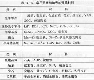一般用硬質(zhì)研具的加工方法稱為研磨,用軟質(zhì)材料作研具的稱為拋光。在精密加工中,研磨和拋光是難于區(qū)分的。常用研磨和拋光的硬脆材料見表14-5。