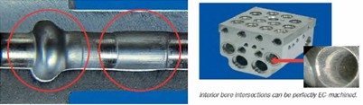 磨粒流加工工藝的原理是:采用高分子聚合物或者是能達到一定切削力的磨料,通過擠壓作用,流動磨料中間的磨粒不斷對工件表面進行研磨,從而達到拋光去毛刺的加工效果。 磨粒具有流動性,只要通過擠壓,磨?梢赃_到常規(guī)刀具所不能到達的孔內(nèi)部,特別是微