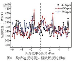 圖8為不同旋轉(zhuǎn)速度下接頭的顯微硬度,隨著旋轉(zhuǎn)速度的提高,二次β晶粒的尺寸不斷增大,使得攪拌區(qū)的硬度略有下降。