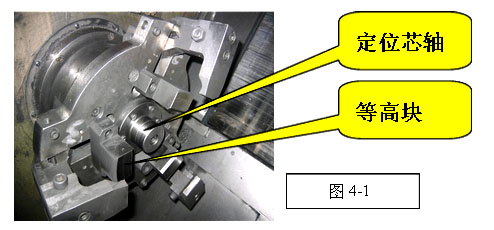 該零件要加工正反兩面,在兩臺(tái)數(shù)控車床上加工,正面加工是以三爪卡盤(pán)夾緊反面軸承孔位外圓再以三個(gè)頂針頂靠凸臺(tái)面,來(lái)加工正面的法蘭面及軸承孔的粗精加工(見(jiàn)圖3)。反面加工是以定位芯軸和三個(gè)等高定位塊定位,三個(gè)拉爪壓緊來(lái)粗精加工反面的軸承孔并確保長(zhǎng)短尺寸(見(jiàn)圖4-1);